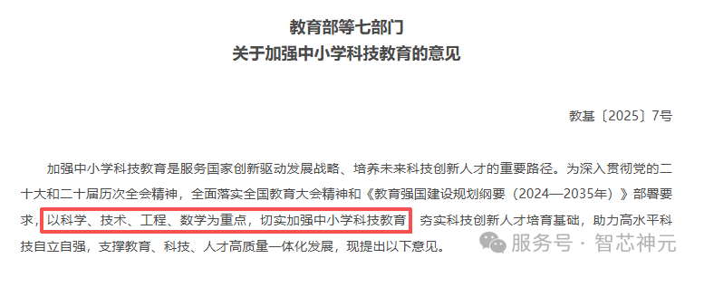 《教育部等七部门关于加强中小学科技教育的意见》(教基〔2025〕7号)的出台,标志着我国基础教育进入一个以科技教育为核心战略的新阶段。“科学教育”到“科技教育”的一字之变,并非简单的术语更迭,而是国家在面对新一轮科技革命与产业变革的宏观背景下,对人才培养模式作出的前瞻性、战略性调整。